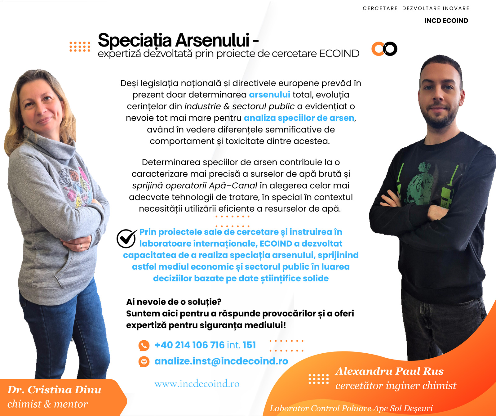 Gestionarea corectă a riscurilor asociate arsenului necesită mai mult decât determinarea concentrației totale. La INCD-ECOIND, punem la dispoziția operatorilor economici analize de speciere a arsenului, care permit identificarea formelor chimice și evaluarea reală a toxicității acestuia în sol, apă sau alte matrici de interes.