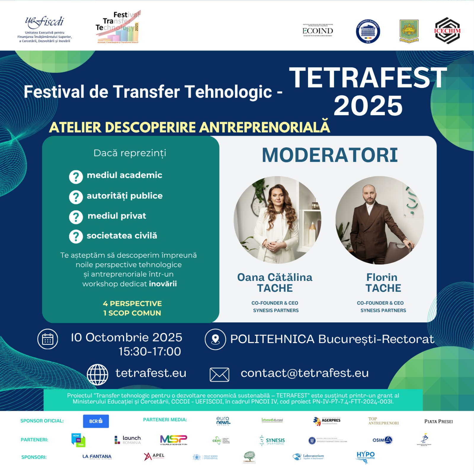 💡 Te invităm să participi la Atelierul de Descoperire Antreprenorială, parte din Festivalul de Transfer Tehnologic – TETRAFEST 2025, un eveniment dedicat colaborării între mediul academic, public, privat și societatea civilă pentru a construi noi direcții strategice de dezvoltare prin inovație.
